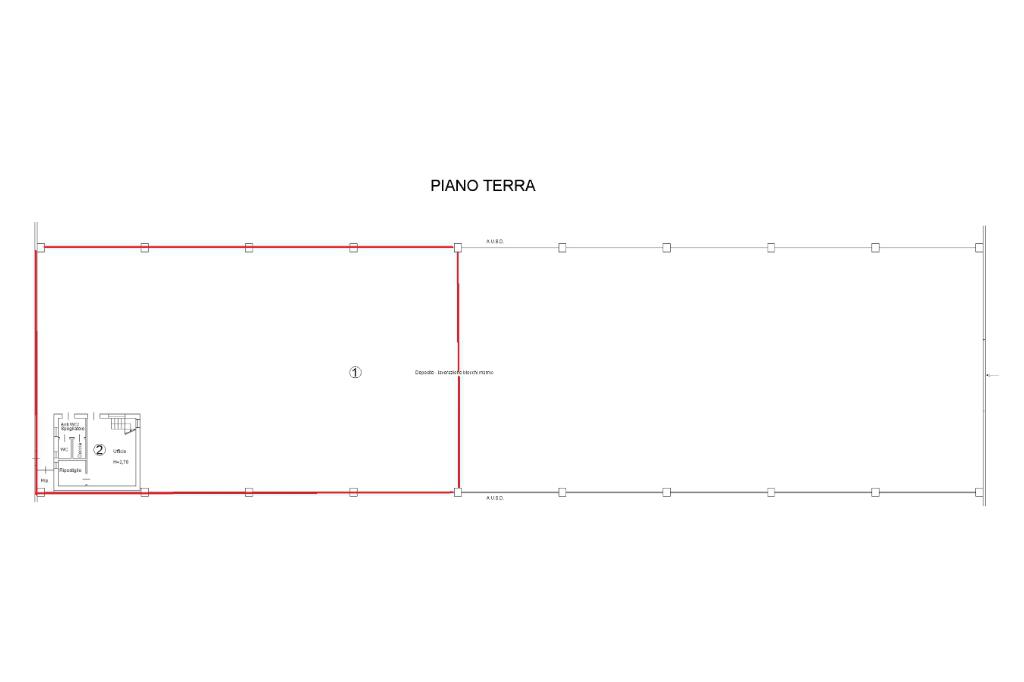 Piano terra: superficie di 700 mq (35 m x 20 m) di cui 650 mq ad uso capannone e 50 mq (7,30 m x 7 m) ad uso ufficio.
